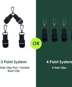 - Avec le système à 3 ou 4 points d’ancrage avec des des anneaux de métal ou des attaches pour une grande sécurité.