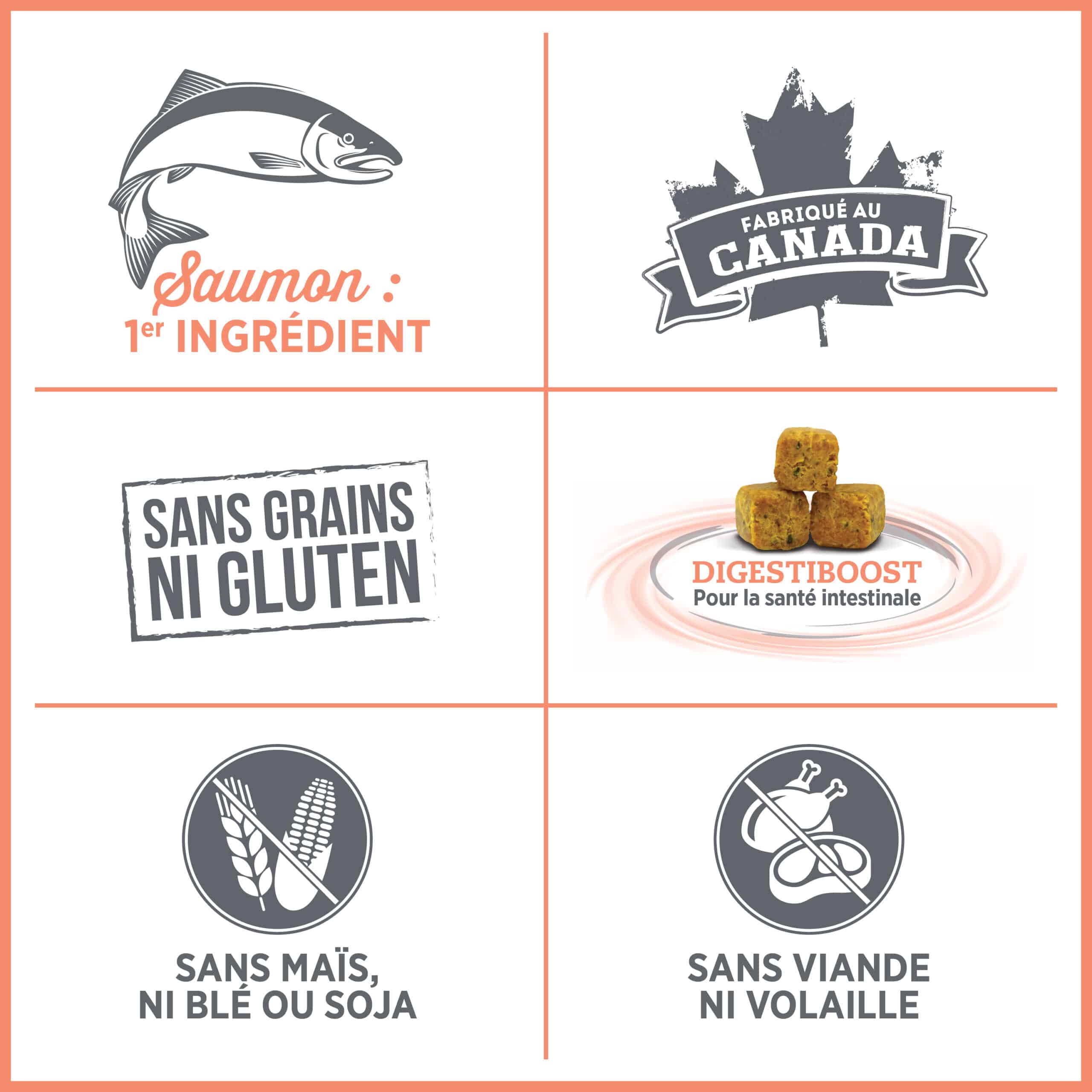 De plus, le poisson est naturellement riche en oméga-3, lesquels sont reconnus pour aider à maintenir une peau et un pelage sains. Aussi, des ingrédients comme de la citrouille, des probiotiques, des prébiotiques, du gingembre, ainsi que des graines de lin contribuent à favoriser un système digestif en santé. Bon nombre de ces ingrédients peuvent être trouvés dans les cubes Digestiboost, inclusions ajoutées pour une santé intestinale optimale.